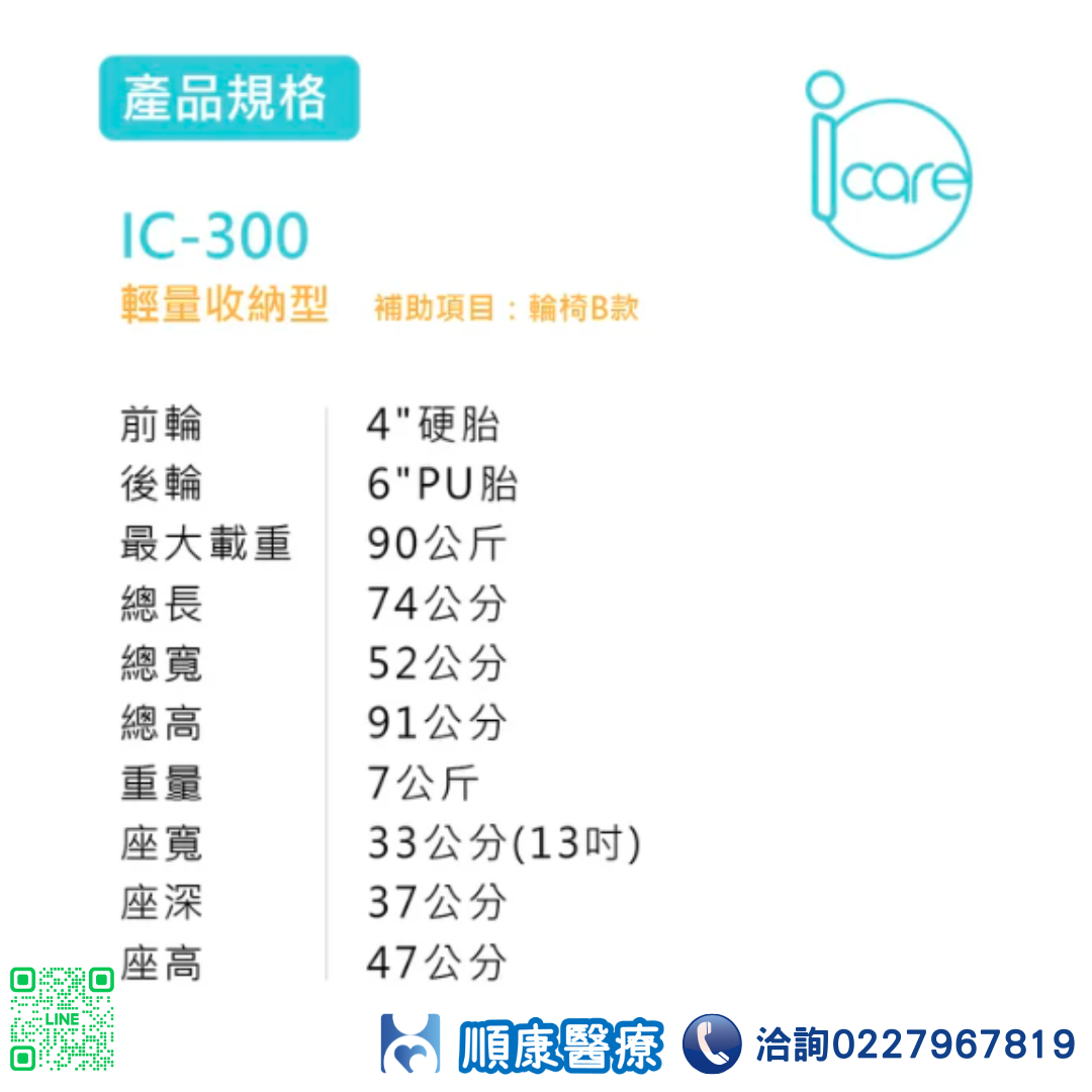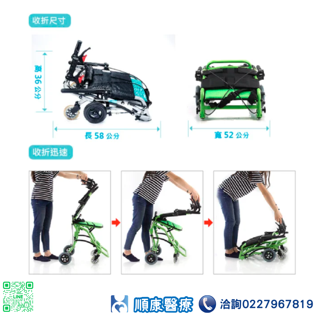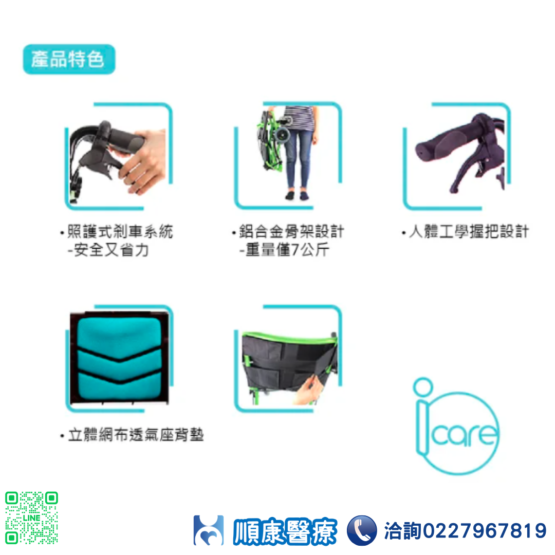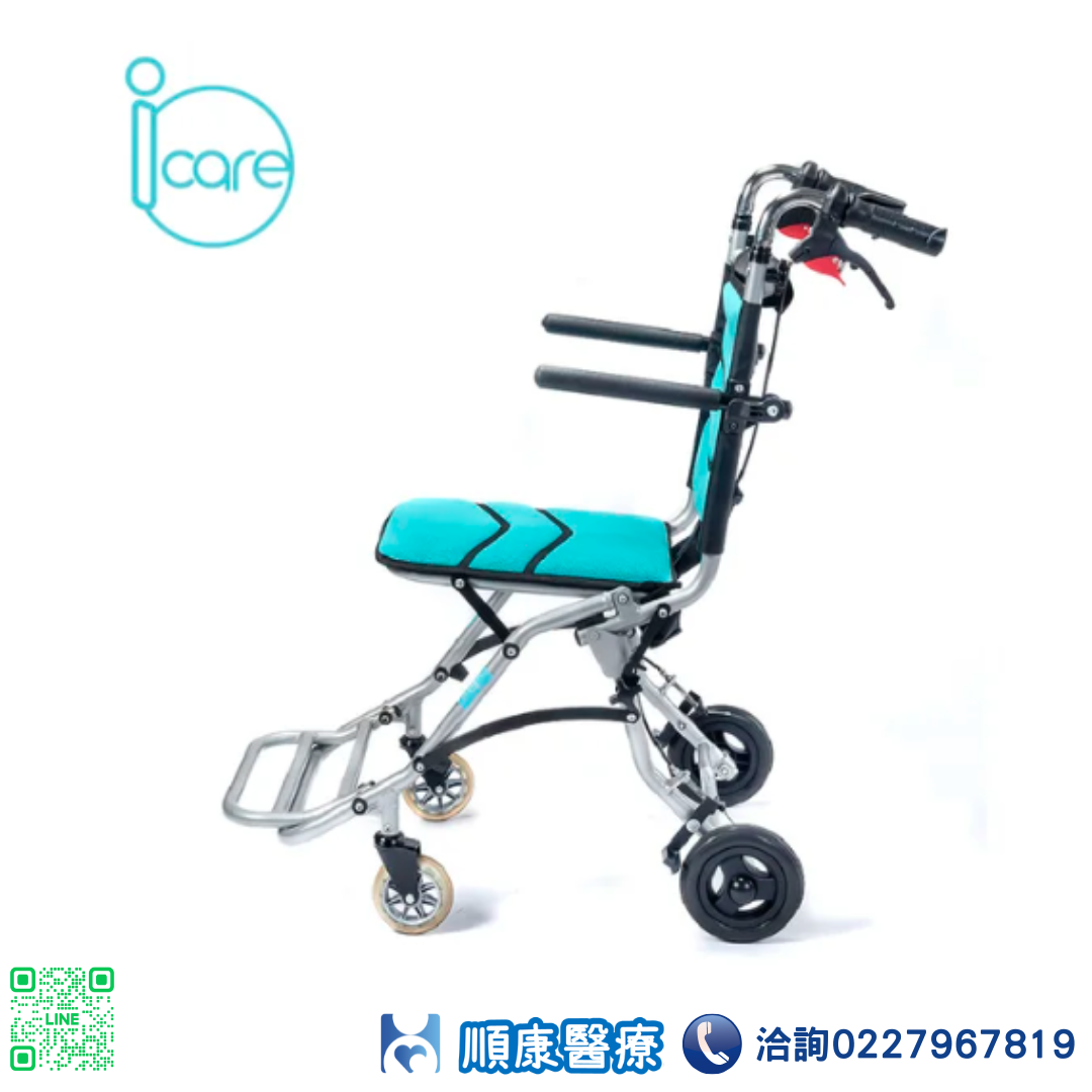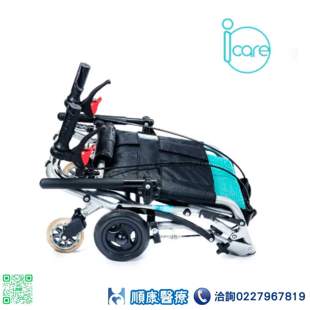 輪椅B款 (輕量化量產型) ■ 鋁合金骨架設計,超輕重量僅7KG ■ 收合後體積超小,完勝所有產品 ■ 流線骨架設計 搭配閃銀色烤漆及水藍色透氣布 光鮮亮麗