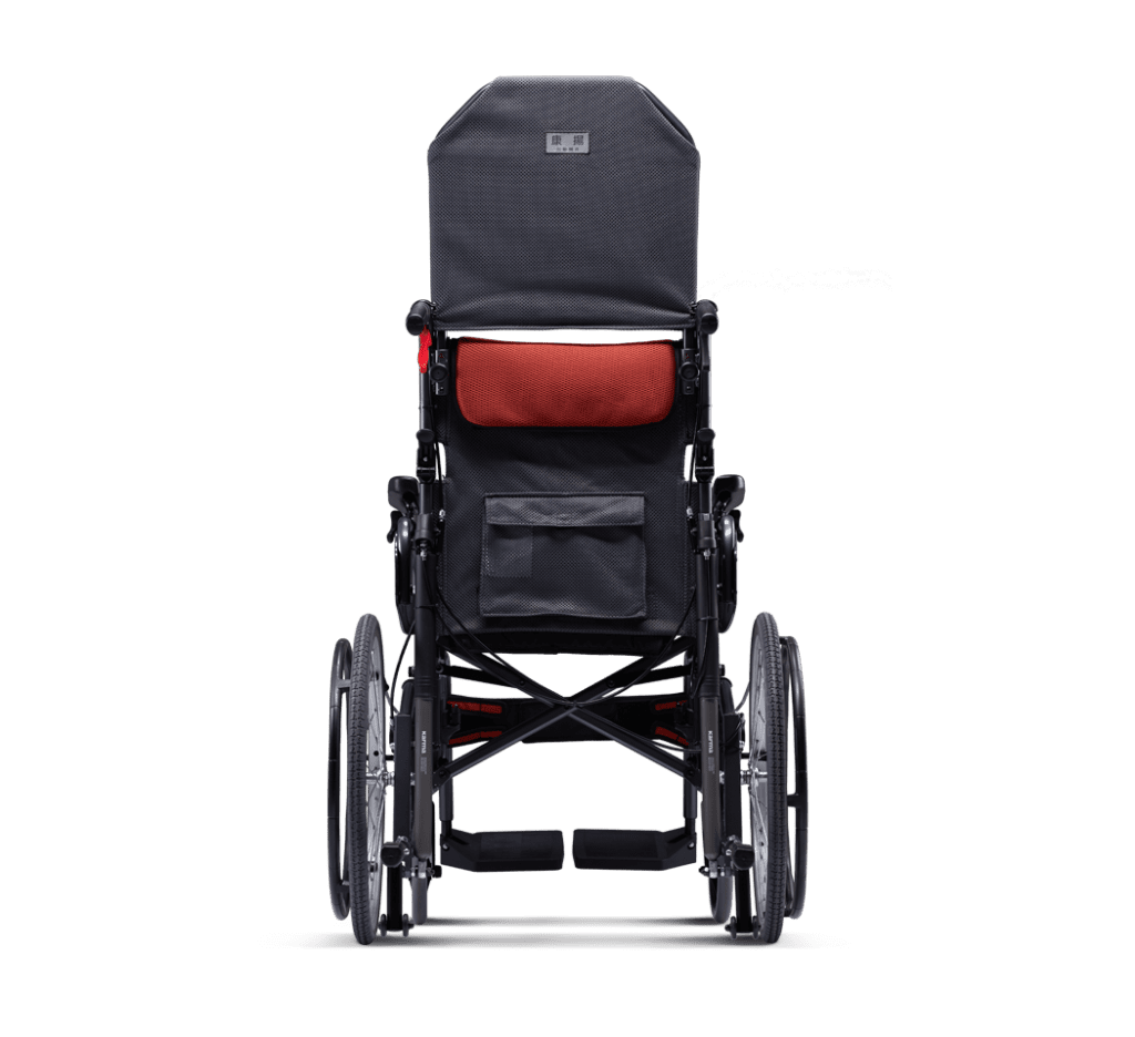 •安全重心潛移裝置 為了克服空中傾倒輪椅在操作時,乘坐者可能產生的不安全感,座椅系統在坐姿變換時,將乘坐者的重心保持在最安定的位置。